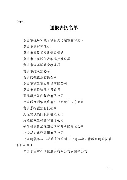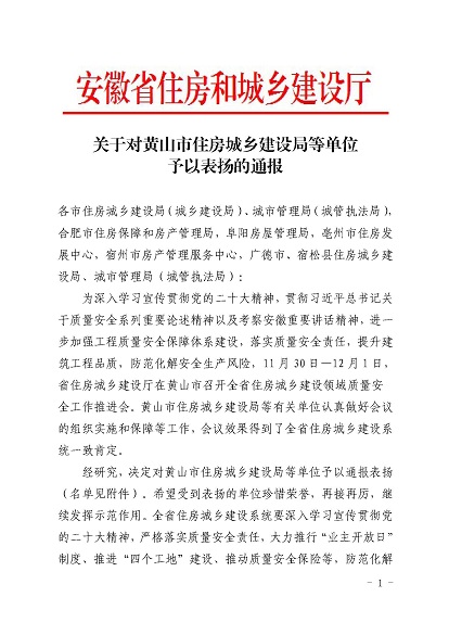 近日,安徽省住房和城鄉(xiāng)建設廳印發(fā)《關于對黃山市住房和城鄉(xiāng)建設局等單位予以表揚的通報》,《通報》指出,11月30日-12月1日,省住房和城鄉(xiāng)建設廳在黃山市召開全省住房建設領域質(zhì)量安全工作推進會,會議效果得到全省住房城鄉(xiāng)建設系統(tǒng)一致肯定,并對在此次會議認真做好組織實施和保障的單位予以通報表揚,黃山市建工集團股份有限公司作為唯一一家本土建筑施工企業(yè)榮獲表揚。