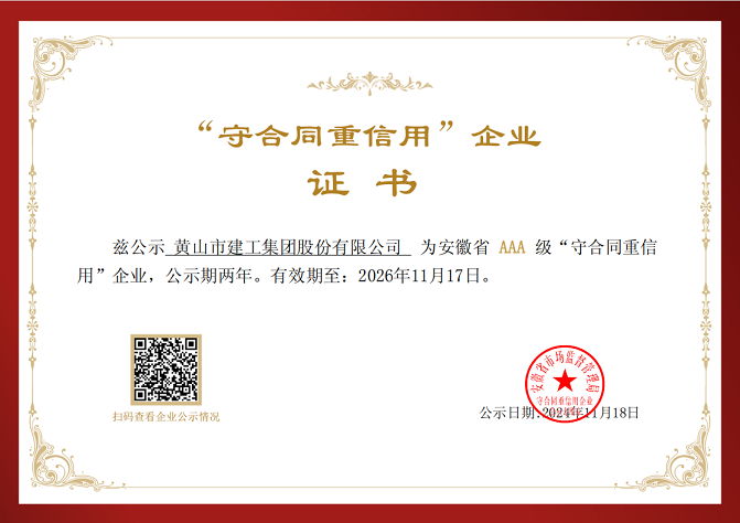 黃山建工集團已多次獲得該榮譽,未來,黃山建工集團將繼續發揚誠信務實的企業作風,不斷深化合規管理和信用自律,筑牢風險防控堅實屏障,為促進社會誠信體系建設,創造良好的市場經濟秩序,推動建筑行業的健康發展貢獻更多力量。