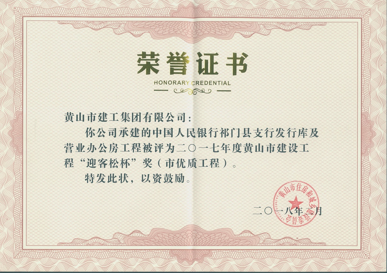 2018年度黃山市建設(shè)工程優(yōu)質(zhì)工程獎(jiǎng)